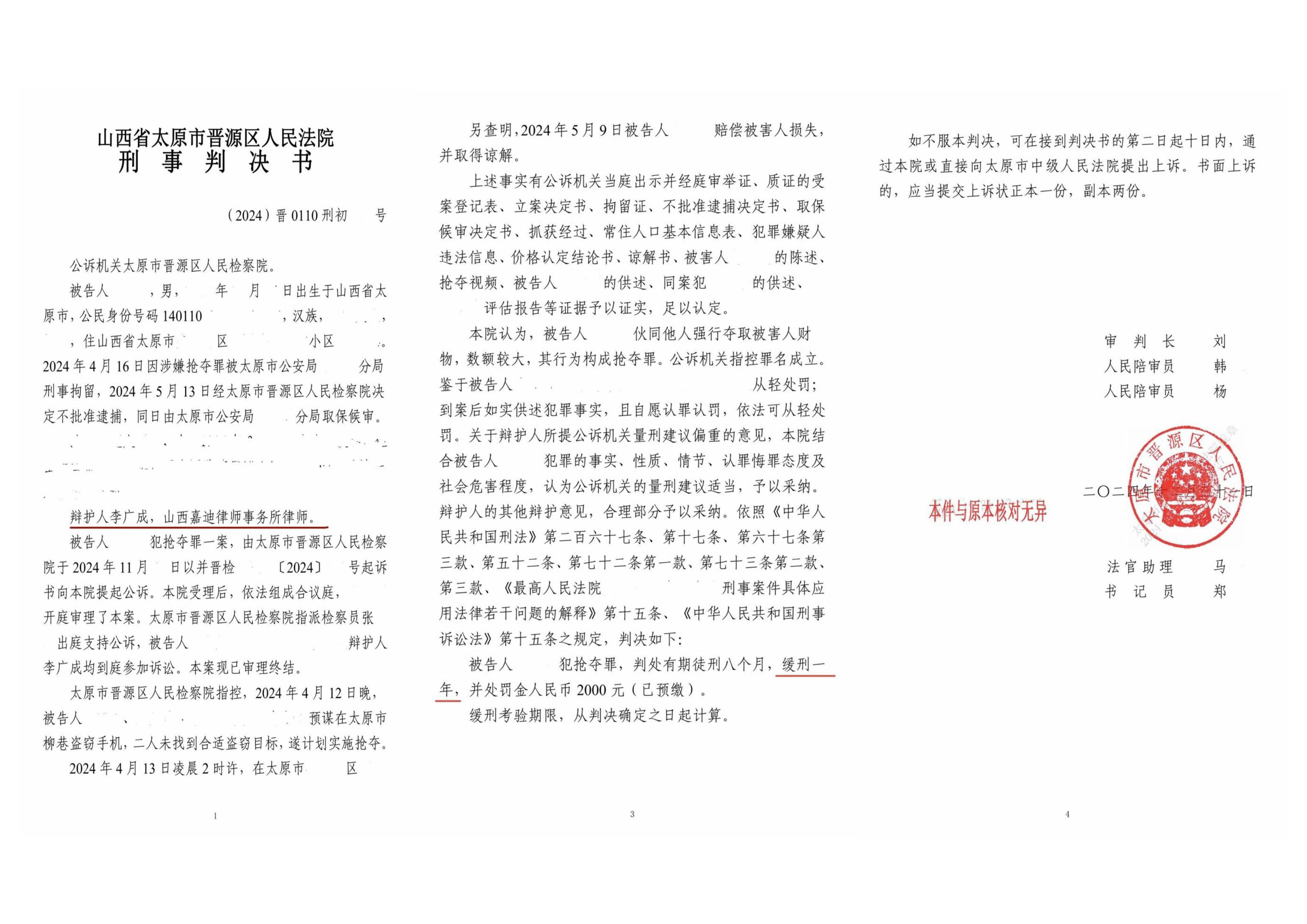一起抢夺罪刑事案件,经过太原李广成律师成功有效辩护,被告人被判缓刑,最大限度维护了被告人的合法权益。