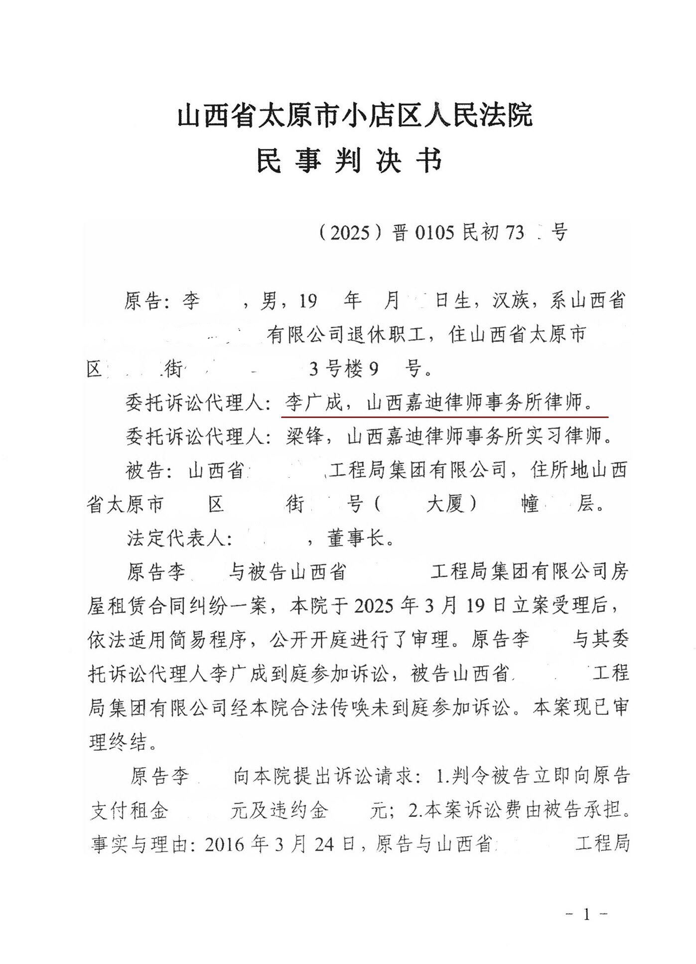最终,经过李广成律师的成功代理,法院依法判决山西省某工程局集团有限公司一次性支付李某拖欠的租金,并向李某支付违约金。本案获得完全胜诉,为委托人李某要回了被拖欠的全部租金,充分维护了其合法权益,达到了依法维权的目的。