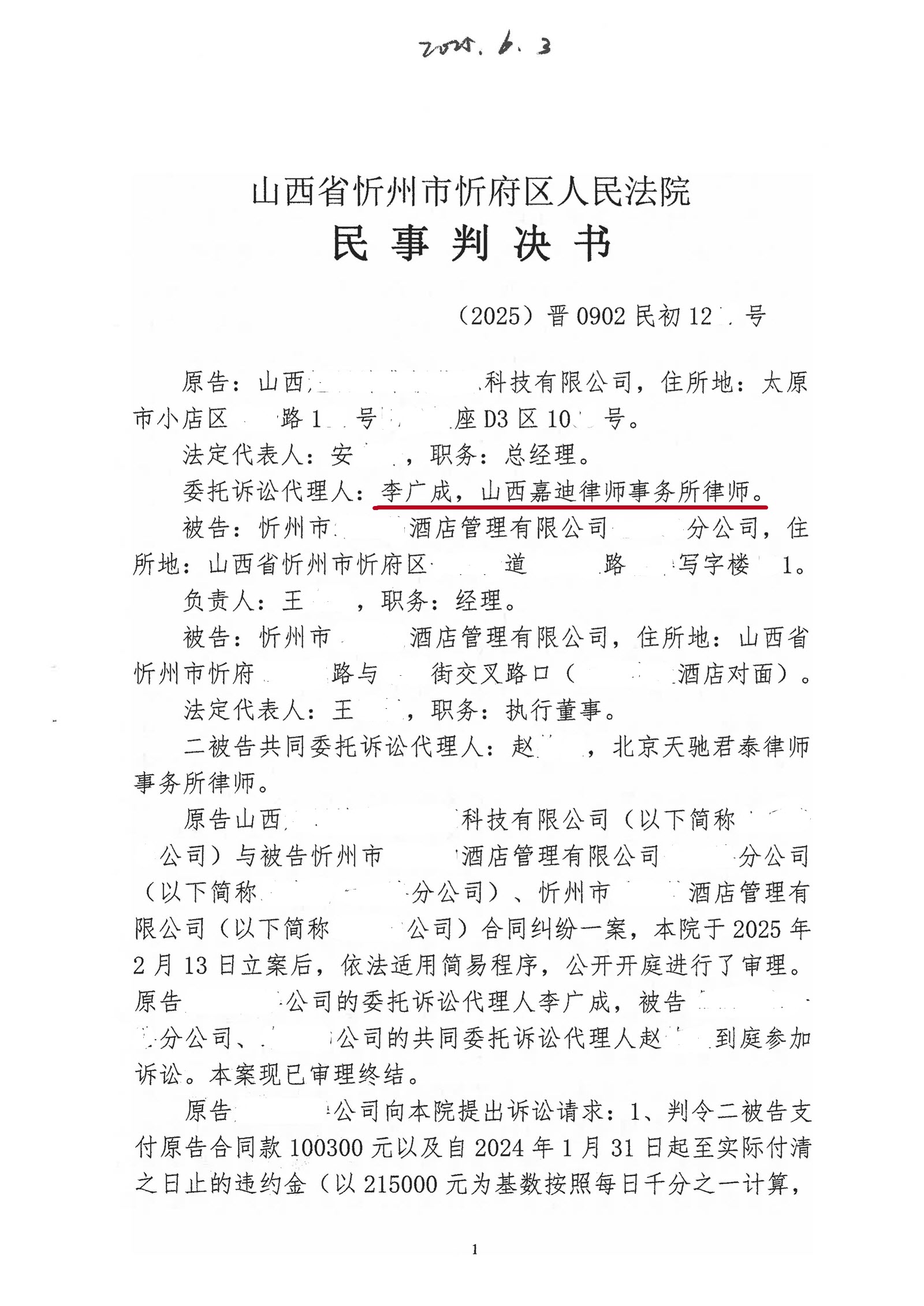 2025-07-02 太原李广成律师成功代理供货安装合同纠纷案获得胜诉,法院支持了原告主张的合同款、增量款、签证款、违约金、律师费等诉讼请求,充分维护了委托人合法权益。