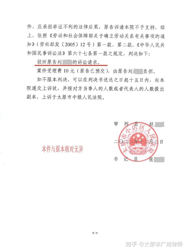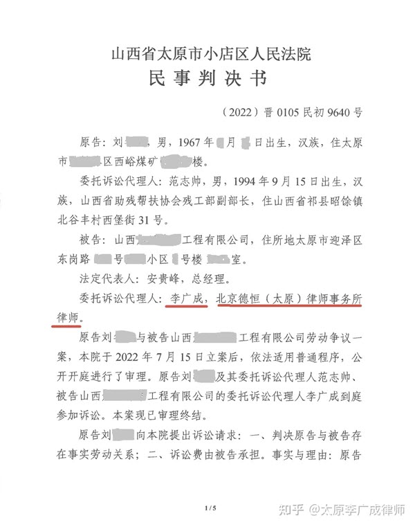 太原李广成律师成功代理一起要求确认存在事实劳动关系的劳动争议案件,法院完全采纳了本律师的代理意见,驳回了原告的诉讼请求。